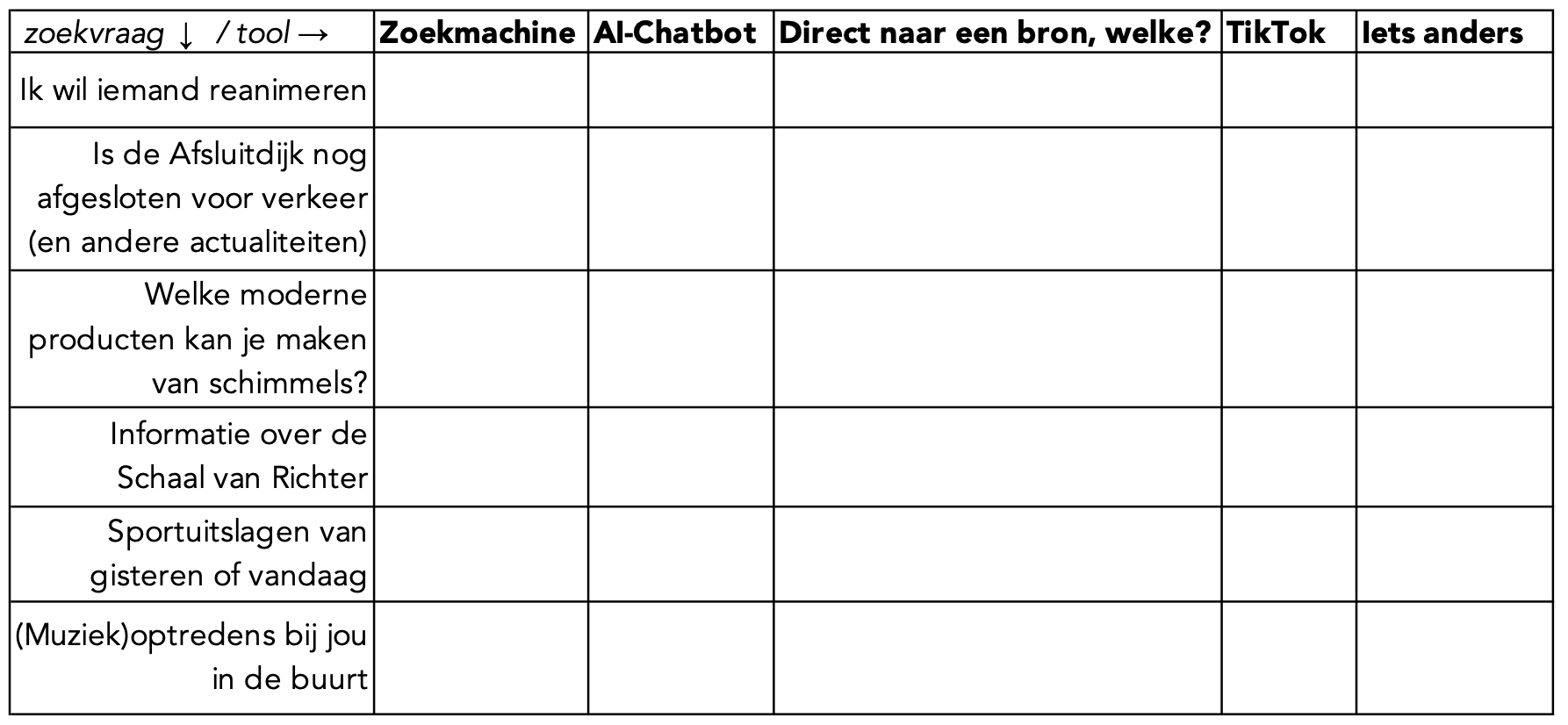 Gebruik dit grid sprenger.stackstorage.com/s/zoekbedoelingen-grid2601 om samen in de klas een onderzoekje te doen naar verschillende zoekbedoelingen (zoekintenties). Pas de informatiewens (zoekvraag) naar behoefte aan.