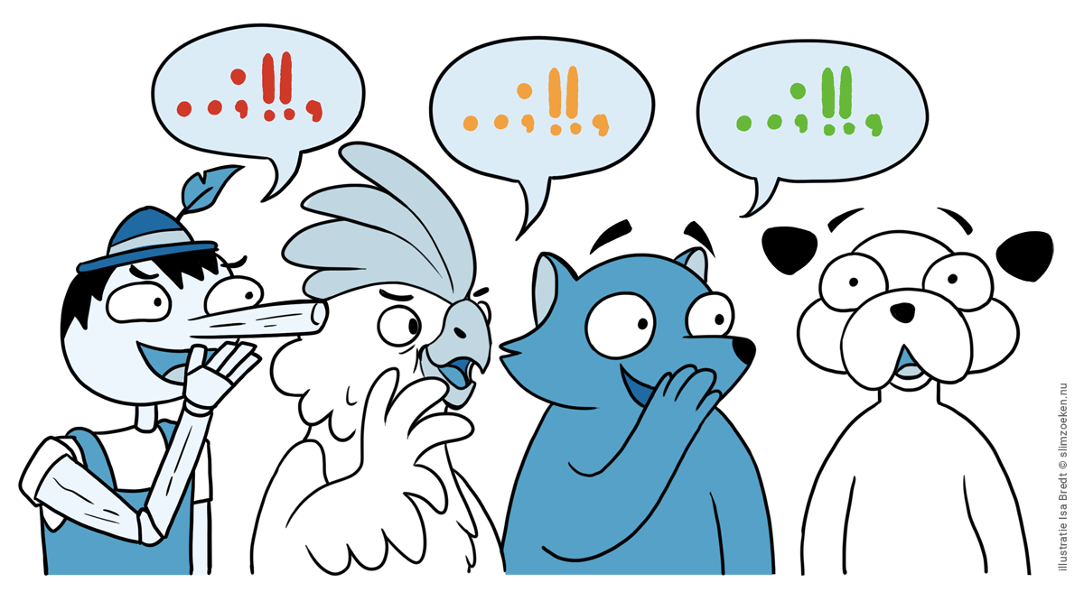 Let er dus op wie de echte bron is. Daarbij worden afzender en echte maker ook nogal eens door elkaar gehaald, zeker bij social media! Dit plaatje over nepnieuws illustreert dat. Links staat de bron, Pinokkio, een leugenaar. Een papegaai praat hem na, en via een vriend komt de informatie bij jou. Omdat het je vriend of vriendin is die jou informeerde zou je kunnen denken: mijn bron klopt. Maar je vriend is de afzender, niet de bron. Zo kan het met elk bericht gaan.